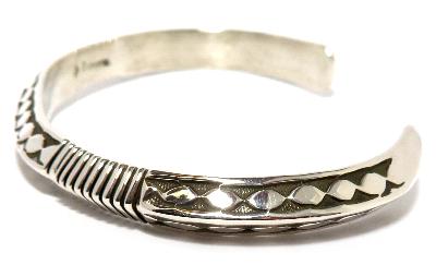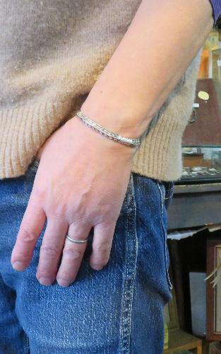 現状手首周り約16.5cm前後の方に合うサイズです。但し、チカラを加えることで縮小15mm、拡大10mm度の調節可能。